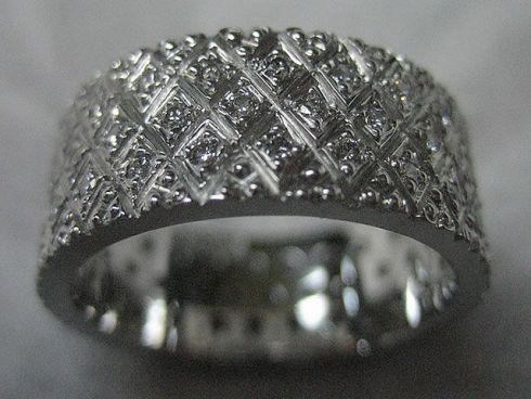 Diamond 64 x 150pct depending on finger size. 7.5mm wide. 1.6mm thick seamless. Made to order in 18ct & above. Price on inquiry.