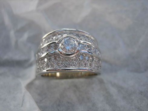 9.5mm wide with .80pct centre stone with 12 x 2.5 mm square cut stones and 52 x .150pct only done in 18ct or platinum (may be both)